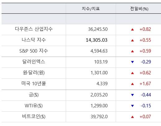 1일(미 동부시간) 뉴욕증권거래소(NYSE)에서 다우존스30산업평균지수는 전장보다 294.61포인트(0.82%) 상승한 36,245.50으로 거래를 마쳤다. 스탠더드앤드푸어스(S&P)500지수는 전장보다 26.83포인트(0.59%) 오른 4,594.63으로, 나스닥지수는 전장보다 78.81포인트(0.55%) 상승한 14,305.03으로 장을 마감했다.