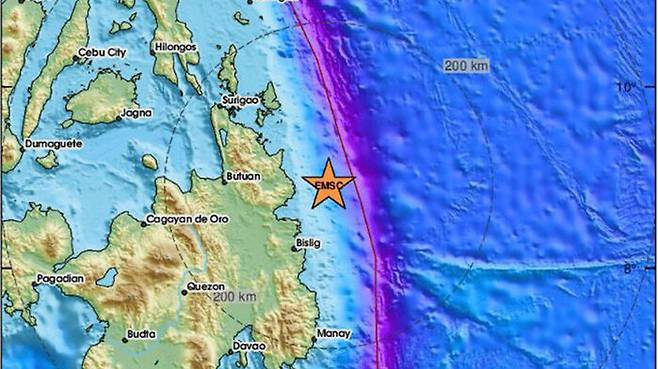 유럽지중해지진센터(ESMC)에 따르면 지진은 이날 오전 3시49분 필리핀 민다나오섬 북부의 부투안 동쪽 117km 지점에서 발생했으며, 진앙의 깊이는 39km입니다.