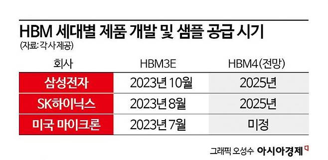 현재 삼성전자와 SK하이닉스, 미국 마이크론은 HBM 최신 제품으로 HBM3E를 개발한 상태입니다. HBM은 그간 1세대(HBM), 2세대(HBM2), 3세대(HBM2E), 4세대(HBM3) 순으로 나왔으며 내년엔 5세대인 HBM3E가 시장에서 본격적으로 쓰인다고 합니다.