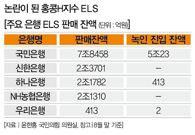 이번 홍콩H지수 ELS 사태의 파급력은 적지 않을 전망이다. ELS 전체 발행 잔액 20조5000억원 중 국내 5대 시중은행이 판매한 규모가 14조5664억원에 달해서다(올해 8월 말 기준). KB국민은행이 7조8458억원으로 가장 많았고, 신한은행(2조3701억원), 하나은행(2조1782억원), NH농협은행(2조1310억원), 우리은행(413억원) 등이 뒤를 이었다. 이중 5조438억원이 손실 구간인 녹인에 진입했다.