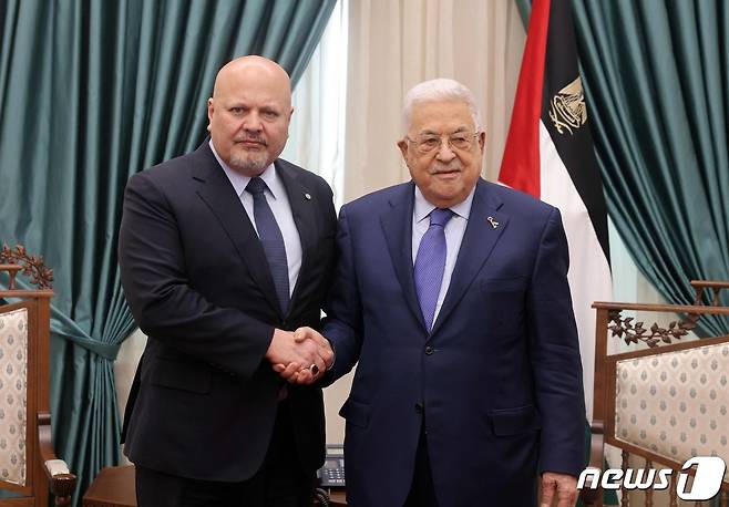 (라말라 AFP=뉴스1) 김예슬 기자 = 카림 칸 국제형사재판소(ICC) 검사장이 2일(현지시간) 마흐무드 압바스 팔레스타인 자치정부(PA) 수반과 서안지구 라말라에서 만났다. 23.12.02