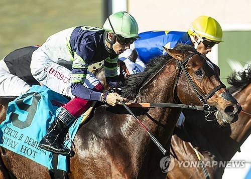 In this image provided by Benoit Photo, Stay Hot (9), with Antonio Fresu aboard, wins the Grade III $100,000 Cecil B. DeMille Stakes horse race Sunday, Dec. 3, 2023, at Del Mar Thoroughbred Club in Del Mar, Calif. (Benoit Photo via AP) AP PROVIDES ACCESS TO THIS THIRD PARTY PHOTO SOLELY TO ILLUSTRATE NEWS REPORTING OR COMMENTARY ON FACTS DEPICTED IN IMAGE; MUST BE USED WITHIN 14 DAYS FROM TRANSMISSION; NO ARCHIVING; NO LICENSING; MANDATORY CREDIT