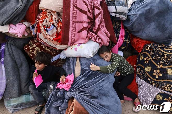 (라파 AFP=뉴스1) 최종일 기자 = 3일(현지시간) 팔레스타인 가자지구 중부와 남부를 떠난 피난민들이 가자 남부 라파 서쪽에 있는 톨 엘-술탄 캠프에서 천막을 설치하고 있는 가운데 아이들은 담요에서 쉬고 있다.