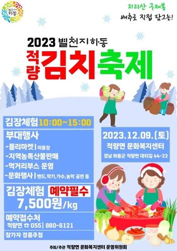 청정 지리산 구재봉 자락에서 재배된 신선한 배추와 고추 등의 양념으로 김장 체험하고 가져가는 2023 별천지 하동 적량 김치축제가 오는 9일 적량면문화복지센터에서 열린다.