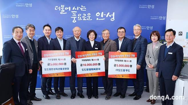 김보라 안성시장은 "도드람양돈협동조합은 안성지역 사회에 장학금 및 발전기금, 가축방역비 지원 등 꾸준히 기부활동을 진행해왔다"며 "어려운 시기에 또 한 번 기부에 참여해 감사드리며 앞으로도 안성 지역 경제와 인재 육성을 위해 동참해 주시기를 바란다"고 말했다.