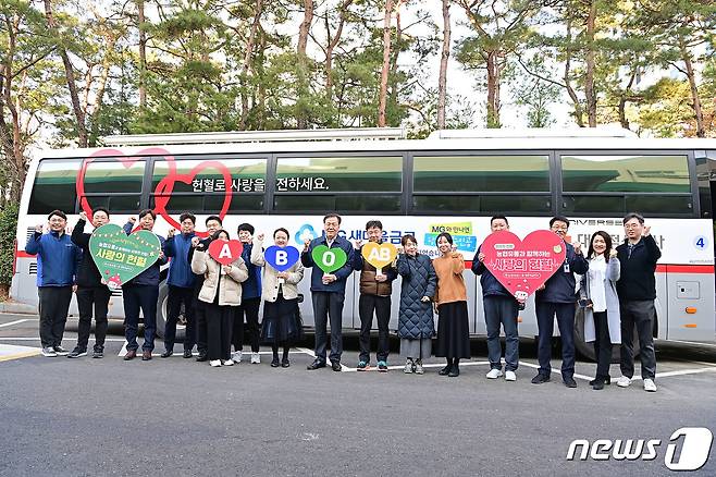 (서울=뉴스1) = 농협유통·농협하나로유통 임직원들이 4일 서울 서초구 하나로마트 양재점에서 사랑 나눔 헌혈 캠페인을 알리고 있다. (농협유통 제공) 2023.12.4/뉴스1