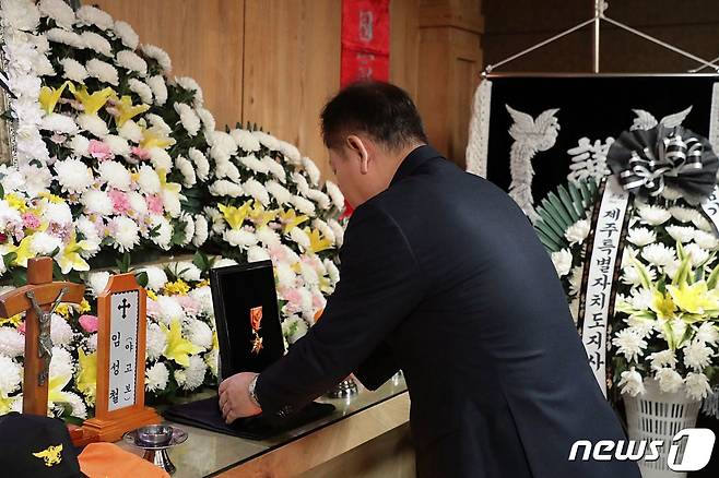 (서울=뉴스1) = 이상민 행정안전부 장관이 4일 오전 제주도의 한 감귤창고에서 발생한 화재를 진압하던 중 순직한 고(故) 임성철 소방장의 장례식장을 찾아 옥조근정훈장을 추서하고 있다. (행정안전부 제공) 2023.12.4/뉴스1
