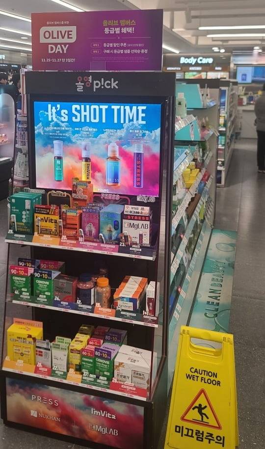 건강기능식품 업계 관계자는 “CJ올리브영이 건기식의 대표 업체들 20여 곳과 함께 작년부터 H프로젝트를 준비했다”며 “전국 매장의 핵심 매대를 건기식으로 채울 만큼 상당한 투자를 진행 중”이라고 말했다. 올리브영 매장마다 입구로부터 가장 눈에 띄는 매대에 ‘뉴칸’, ‘아임비타’, ‘프레스샷’, ‘마그랩’ 등 건기식을 배치하고 있다.