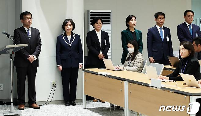 (서울=뉴스1) 오대일 기자 = 최상목 경제부총리 겸 기획재정부 장관 후보자를 비롯한 6개 부처 장관 후보자들이 4일 용산 대통령실 청사 브리핑룸에서 열린 김대기 비서실장의 인선 발표 브리핑을 경청하고 있다. 왼쪽부터 최상목 기획재정부 장관 후보자, 강정애 국가보훈부 장관 후보자, 송미령 농림축산식품부 장관 후보자, 오영주 중소벤처기업부 장관 후보자, 박상우 국토교통부 장관 후보자, 강도형 해양수산부 장관 후보자. 2023.12.4/뉴스1