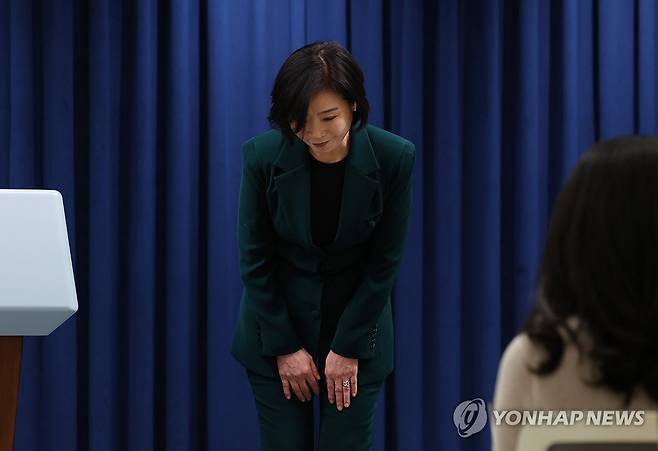 (서울=연합뉴스) 진성철 기자 = 오영주 중소벤처기업부 장관 후보자가 4일 서울 용산 대통령실 청사에서 인사하고 있다. 2023.12.4