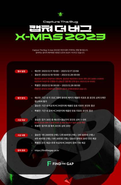 파인더갭은 12월 11일부터 12월 25일까지 제3회 X-MAS Capture The Bug 이벤트(이하 X-MAS CTB)를 주최한다고 밝혔다.