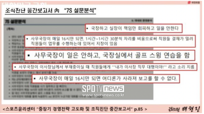 덧붙여, 윤리센터가 지난 9월 자체 발간한 ‘중장기 경영전략 고도화 및 및 조직진단 중간보고서’에 직원들이 익명으로 인터뷰한 내용을 보면 더 충격적이다. 근무 태만에 대해 노골적으로 지적한 것이다.
