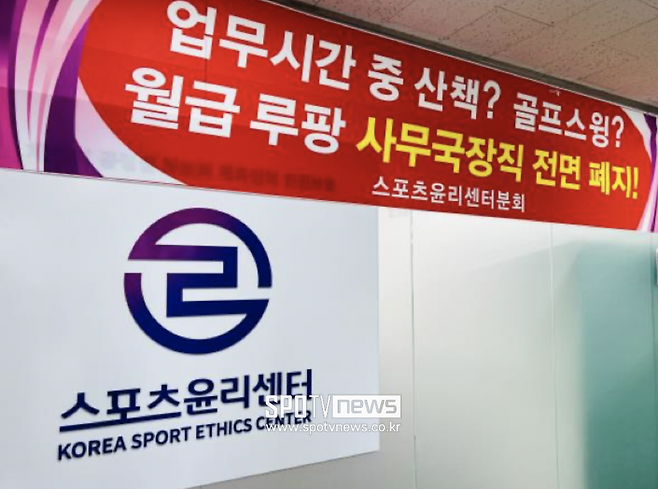 [스포티비뉴스=배정호 기자] 스포츠윤리센터가 내부적으로 매우 시끄럽다. 스포츠윤리센터 분회는 29일(수), 사무국장에 대한 직위해제 및 사퇴를 요구하는 현수막을 내걸고 농성을 시작했기 때문이다. 사실은 다음과 같다.
