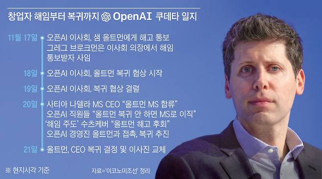 [글로벌 리더] 오픈AI 퇴출 5일 만에 돌아온 ‘챗GPT 아버지’ 샘 올트먼 | 돈과 공익 사이…AI 개발 노선 갈등이 부른 실리콘밸리 쿠데타