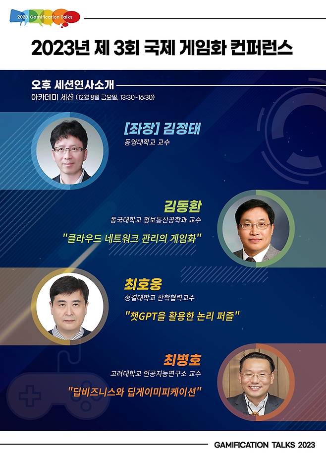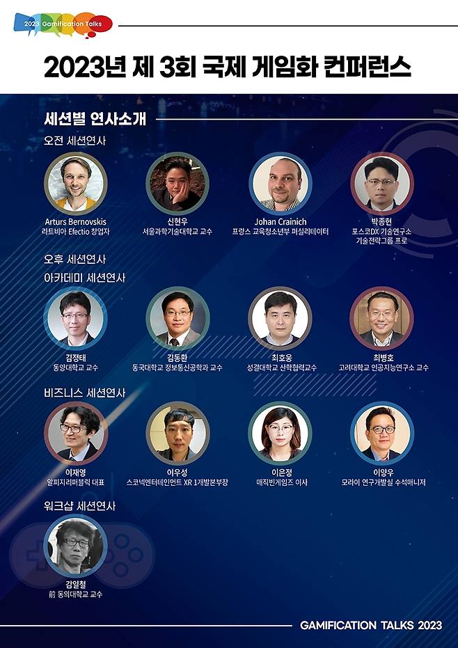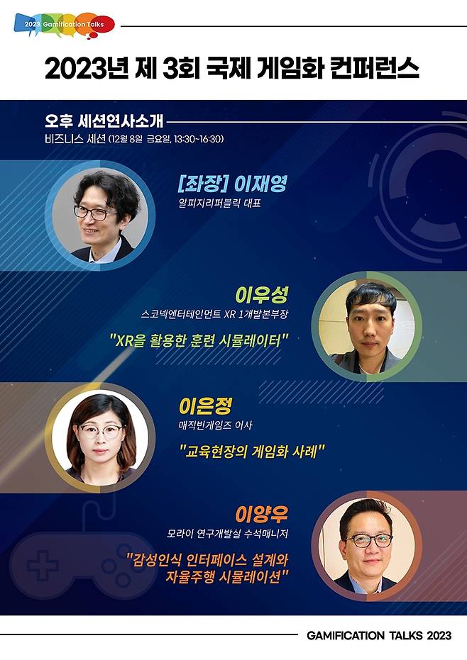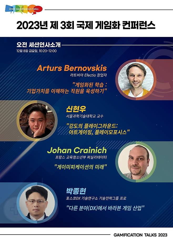 서울시와 한국콘텐츠진흥원이 후원하고 숭실대학교 글로벌미래교육원과 게임화저널이 공동 주관하는 '제3화 국제 게임화 컨퍼런스(2023 Gamification Talks)'는 '일과 배움과 놀이의 융합'을 주제로 개최된다. 행사에는 국민의힘 이준석 전 대표, 한국콘텐츠진흥원 조현래 원장, 게임화 컨퍼런스 조직위원회 이재홍 조직위원장 등 유명 인사도 참여할 예정이다.