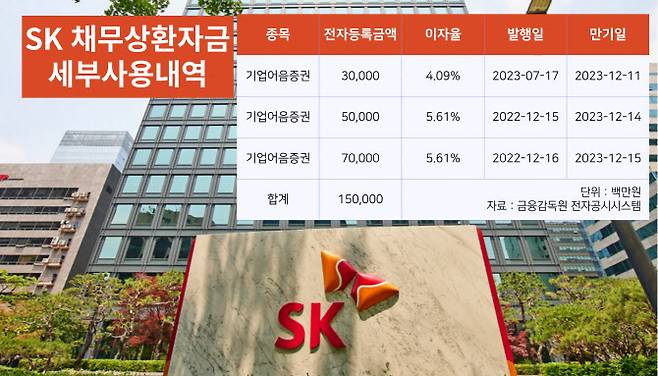 SK는 이번 회사채 발행을 통해 만기가 도래하는 기업어음(CP) 상환 자금으로 사용한다. 회사채 발행 금리가 CP 이자율보다 낮아 이자 비용을 줄일 수 있을 것으로 분석된다.