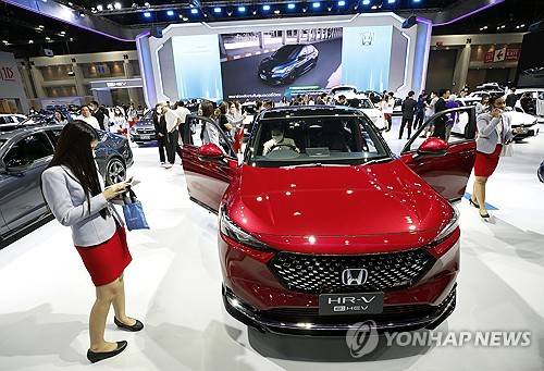 epa11010398 Visitors inspect Honda cars displayed at the 40th Thailand International Motor Expo 2023 in Bangkok, Thailand, 04 December 2023. More than 40 leading brands of international automakers attend to exhibit their automotive products and technology including the new electric vehicles in the annual Thailand International Motor Expo automobile showcase. The imports of electric vehicles (EVs) mainly from China are expected to draw the most interest from auto buyers. EPA/RUNGROJ YONGRIT