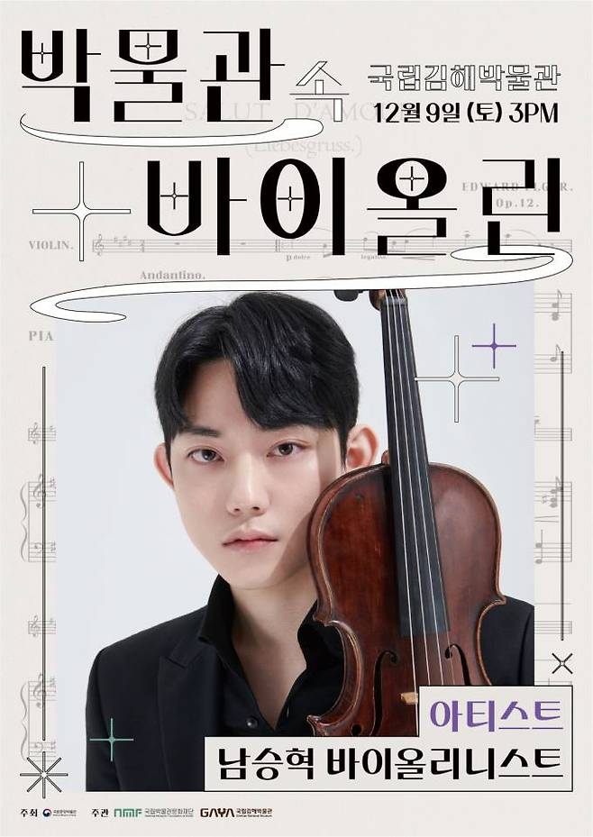 국립김해박물관이 '박물관 속 바이올린' 공연을 박물관 강당에서 선보인다. 이 공연은 국립중앙박물관이 주최하고 국립박물관문화재단이 주관한다.