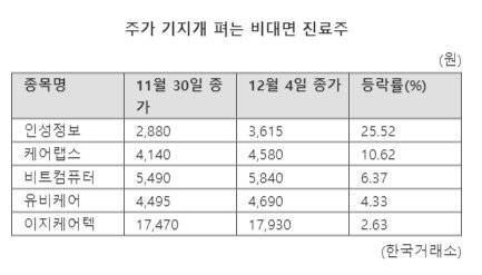 최근 2거래일 간 주가가 뚜렷한 오름세를 보인 곳은 이 외에도 비트컴퓨터와 유비케어가 있다. 이날 종가 기준으로 각각 6.37%, 4.33% 올랐다. 케어랩스와 이지케어텍도 지난 1일 14.01%, 5.38% 오르는 등 최근 주가가 기지개를 펴고 있다. 비대면 진료주로 거론되는 씨아이테크도 이날 장중 4% 이상 오르는 등 1.76% 상승 마감했다.