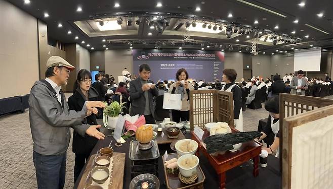 | ▲ 제주 향토음식 해설 2023년 제주 향토음식 품평회에서 양용진 원장이 제주의 출산관련 전통음식을 해설하고 있다. |