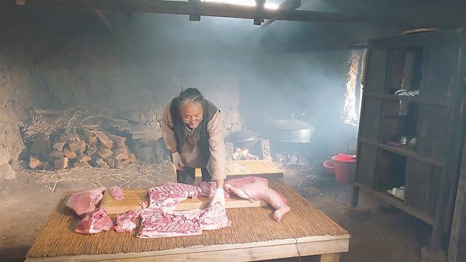 "전통적으로 제주에서 잔치를 할 때는 우선 돼지를 잡는 데서부터 시작했어요. 제주도에선 마을마다 자연스럽게 추대된, 경험 많고 솜씨 좋은 어른이 잔치를 총괄하는데, 도감이라고 합니다. 이 도감이 돼지를 잡고, 삶고, 나누어주는 일까지 모두 담당합니다.