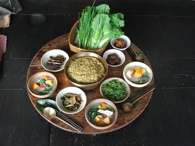 | ▲ 낭푼밥상 제주도 공동체문화를 잘 보여주는 낭푼밥상은 한 가운데에 밥을 가득 담은 낭푼 그릇을 놓고 식구 수대로 국과 수저를 놓는다. 밥은 주로 잡곡으로 지었고, 푸른 잎 채소와 발효음식으로 차려진 건강밥상이다. |