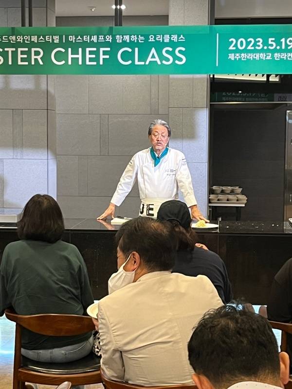 | ▲ 요리강좌 진행 양용진 원장은 제주 전통음식이나 제주산 식재료를 활용하는 요리강좌를 진행하고 있다. 사진은 2023년 5월 외식업 종사자들을 위한 ‘마스터 쉐프 클래스’ 요리강좌. |