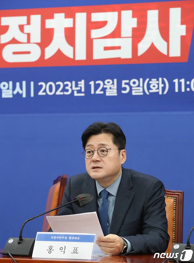(서울=뉴스1) 임세영 기자 = 홍익표 더불어민주당 원내대표가 5일 오전 서울 여의도 국회에서 열린 감사원 정치감사 진상규명 TF 1차 회의에서 발언을 하고 있다. 2023.12.5/뉴스1