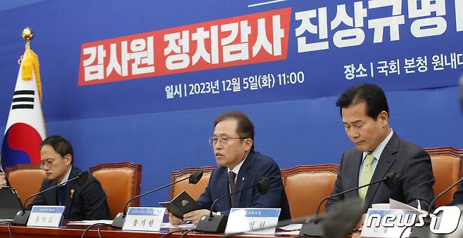 (서울=뉴스1) 임세영 기자 = 송기헌 더불어민주당 감사원 정치감사 진상규명 TF 단장(오른쪽 두번쨰)이 5일 오전 서울 여의도 국회에서 열린 감사원 정치감사 진상규명 TF 1차 회의에서 발언을 하고 있다. 2023.12.5/뉴스1