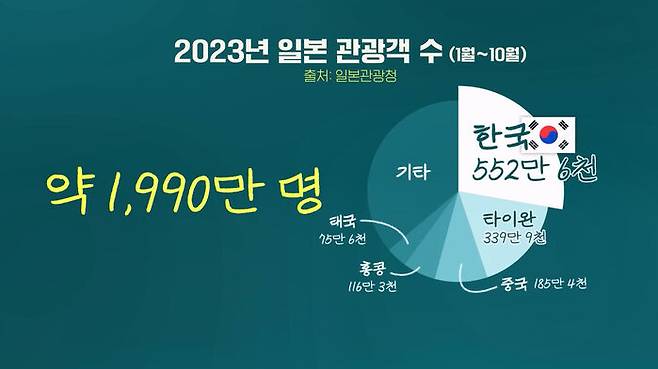 A. 한국 관광객, 일본 입장에서는 지금 가장 고마워하는 외국인 관광객이죠. 올해 1월부터 10월까지 일본을 찾은 관광객이 1,990만 명 정도 되는데 이 가운데 한국인이 약 550만 명입니다. 일본에 온 외국인 관광객 가운데 3~4명 중 1명은 한국 사람이라는 얘기인 거고요. 한국 관광객들이 40만에서 50만 명 정도 매월 들어오고 있거든요. 보통 두 번째로 많이 오는 나라가 타이완 정도인데 타이완과 10만 명에서 한 20만 명 정도 매달 차이가 날 정도, 일본의 현재 관광 부흥을 견인하고 있는 건 한국인이라고 일본 언론에서도 그렇게 분석을 하고 있습니다.