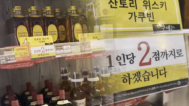 일본의 대표적인 잡화점인 돈키호테라든지 아니면 저가 상품만 파는 백엔샵에도 한국 사람들이 많이 있어요. 한국 사람들이 특히 좋아하는 물품들이 과자라든지 아니면 파스라든지 일부 화장품이라든지 상당히 많이 사고 있었고 최근 한국에는 하이볼이 유행한다고 하던데요. 그래서 그런지 하이볼을 만드는 위스키를 특별히 사는 사람들이 많았는지, 한 사람당 두 병만 살 수 있다고 아예 한글로 적혀 있을 정도로 상당히 한국 사람들이 많이 가는구나라는 그런 상황을 알 수가 있었습니다.