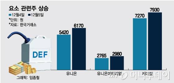 5일 코스피 시장에서 유니온은 전 거래일 대비 750원(13.84%) 오른 6170원에 거래를 마쳤다. 유니온머티리얼은 7.78%, KG케미칼은 9.08%, 조비는 3.85%, 남해화학은 2.48% 상승했다. 코스닥 시장에서 누보는 1.48% 올랐다. 모두 요소수, 비료 등 요소 관련 종목들로 요소 수급 우려가 부각되면서 주가가 크게 뛰었다.