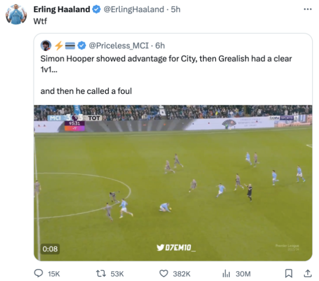 상황은 이러했다. 후반 추가시간 4분 맨시티는 역습을 전개했다. 로드리의 공을 받으러 내려오던 홀란은 토트넘의 에메르송 로얄의 태클에 걸려 그만 넘어지고 말았다. 홀란은 빠르게 일어나 공격을 이어갔다. 어드밴티지를 얻은 것.