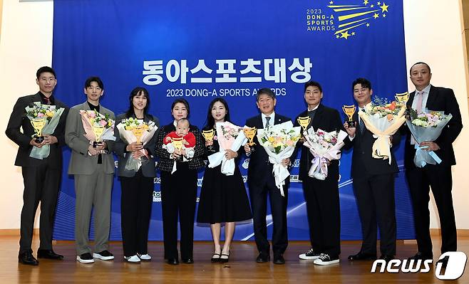 (서울=뉴스1) 김진환 기자 = 남자농구 오세근(서울SK)(왼쪽부터), 남자배구 한선수(대한항공), 여자농구 김단비(아산 우리은행), 남자골프 함정우(하나 금융그룹) 대리수상 강예린 프로(아내), 여자골프 이예원(KB 금융그룹), 특별상 스페셜올림픽코리아 이용훈 회장, 축구 주민규(울산 현대), 야구 노시환(한화이글스), 여자배구 김연경(흥국생명) 대리수상자 이해욱 대표(라이언앳)가 5일 서울 성북구 고려대 백주년기념관에서 열린 2023 동아스포츠대상에서 각 부문 올해의 선수로 선정된 뒤 기념 촬영을 하고 있다. (스포츠동아 제공) 2023.12.5/뉴스1