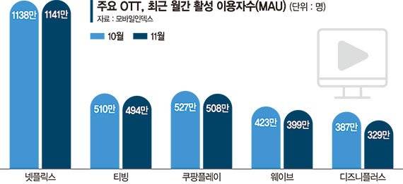 이 같은 상황에서 지난달 넷플릭스가 선두 체제를 굳건히 유지하고 있는 가운데 다른 OTT 플랫폼의 이용자는 감소한 것으로 나타났다. 애플리케이션 분석 서비스 '모바일인덱스'에 따르면 11월 넷플릭스의 MAU는 약 1141만명으로 전달(약 1138만명) 보다 0.3% 증가했다.
