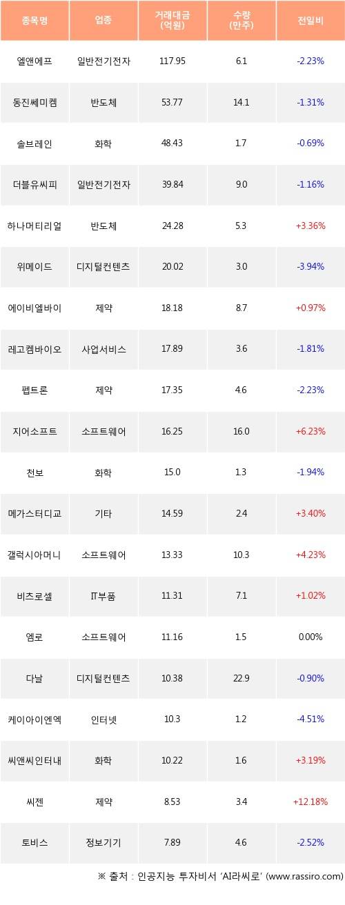 기관 투자자의 순매수 상위 20개 종목은 엘앤에프, 동진쎄미켐, 솔브레인, 더블유씨피, 하나머티리얼즈, 위메이드, 에이비엘바이오, 레고켐바이오, 펩트론, 지어소프트등이다.