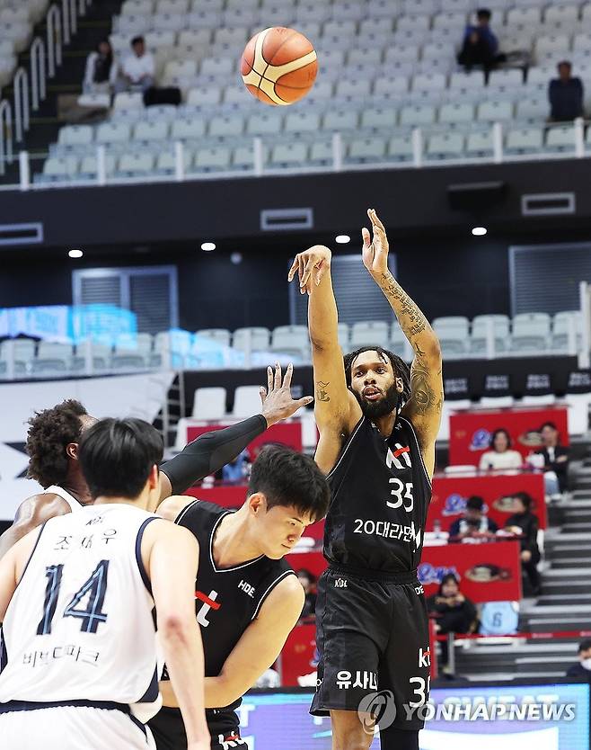 (수원=연합뉴스) 홍기원 기자 = 5일 경기도 서수원칠보체육관에서 열린 프로농구 수원 KT 소닉붐과 고양 소노 스카이거너스의 경기. KT 배스가 슛하고 있다. 2023.12.5