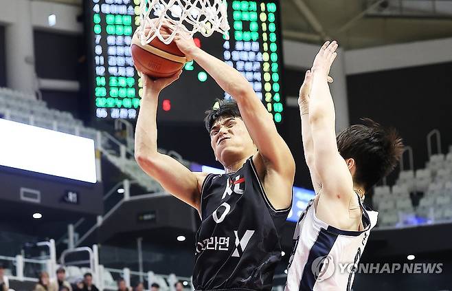 (수원=연합뉴스) 홍기원 기자 = 5일 경기도 서수원칠보체육관에서 열린 프로농구 수원 KT 소닉붐과 고양 소노 스카이거너스의 경기. KT 하윤기가 슛하고 있다. 2023.12.5