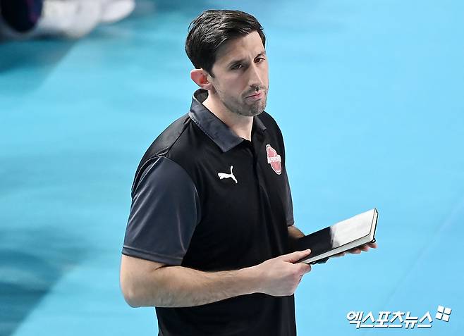 (엑스포츠뉴스 인천, 김한준 기자) 5일 오후 인천 부평구 삼산월드체육관 열린 ‘도드람 2023-2024 V-리그’ 흥국생명과 페퍼저축은행의 경기, 페퍼저축은행 조 트린지 감독이 비디오 판독을 요청하고 있다.