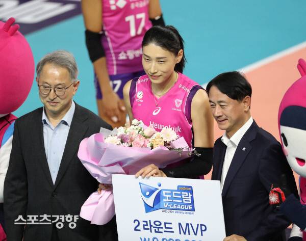 흥국생명 김연경이 5일 인천 삼산월드체육관 열린 ‘도드람 2023-2024 V-리그’ 페퍼저축은행의 경기에 앞서 2라운드 MVP에 선정된 기념촬영을 하고 있다. 2023.12.5. 정지윤 선임기자