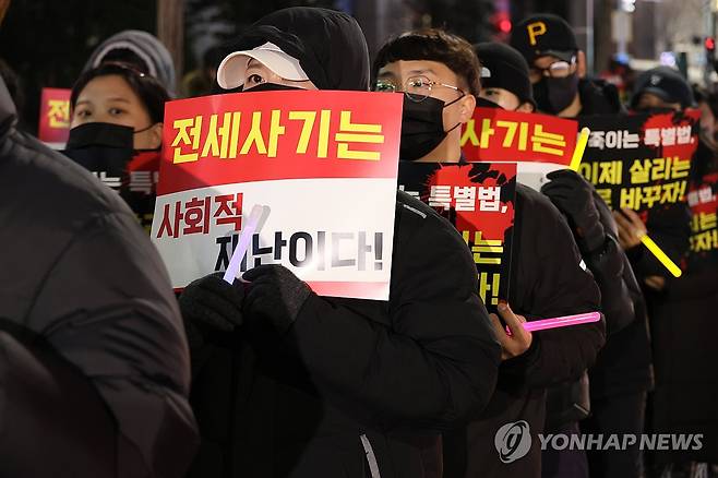 (대전=연합뉴스) 강수환 기자 = 5일 오후 대전전세사기피해대책위(대책위)와 지역 피해자들 220여명이 대전 서구 둔산동에서 정부의 과실 인정 요구와 배상을 촉구하며 정부 여당과 대전시를 규탄하는 거리 행진을 하고 있다. 피해자들은 갤러리아타임월드 앞에서 대전시청 잔디광장으로 이동해 집회를 진행했다. 2023.12.5