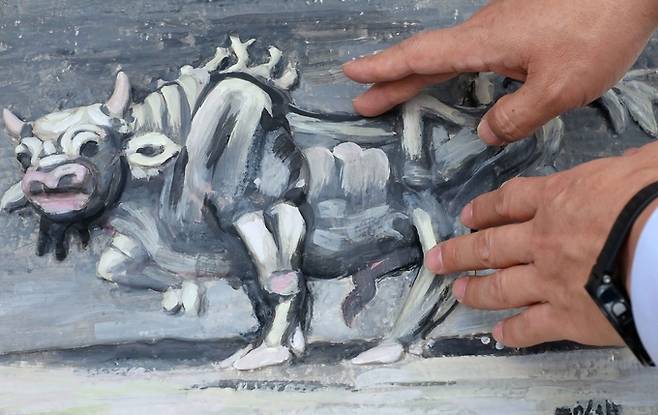시각예술에서 가장 소외된 시각 장애인들을 대상으로 촉각 명화 전시회가 열렸습니다. 한 시각 장애인이 손을 더듬으며 촉각과 상상력으로 이중섭의 ‘흰소’ 작품을 감상합니다. 눈으로 그림을 감상하는 것이 아니라 울퉁불퉁 튀어나온 점토를 손으로 만지면서 느껴봅니다. 또 작품 설명을 담은 오디오북도 함께 제작돼 촉각과 청각으로 그림을 감상합니다.