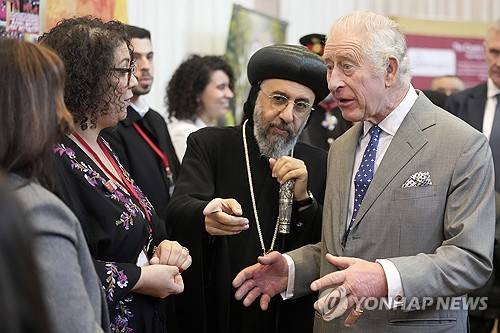 Britain's King Charles III and Archbishop Angaelos, centre, talks to guests as they attend an Advent Service and Christmas Reception at The Coptic Orthodox Church Centre UK in Stevenage, England, Tuesday, Dec. 5, 2023. After the Service, the King met young volunteers from the Church's ministries and members of the Coptic Orthodox Church Congregation, unveiled a plaque and planted a tree. (AP Photo/Kin Cheung, Pool) WPA POOL REUTERS AP AFP PA GETTY NPA IPA CPNA ONLY