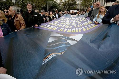 epa11011887 Lawyers shout slogans and carry a huge banner during a protest against the government's tax bill affecting self-employed and free-lancers, taxing them with a deemed income, in Athens, Greece, 05 December 2023. EPA/ORESTIS PANAGIOTOU