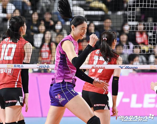 특히 16-16으로 팽팽히 맞선 가운데 오픈 공격을 성공시킨 뒤 18-16에서 페퍼저축은행 박정아의 오픈 공격을 완벽한 블로킹으로 저지한 장면은 이날 최고의 하이라이트였다.