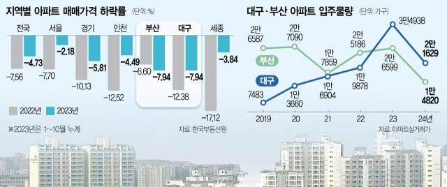 두 지역에서 하락률이 크게 나타난 배경은 미분양 물량이 쌓인 가운데 올해 역대 규모의 입주장이 벌어지며 매물이 쏟아졌기 때문이다. 입주 폭탄에 대구와 부산의 전세 가격 하락폭은 -12.09%, -10.10%로 전국 시도 가운데 하락률 1, 2위를 차지했다.