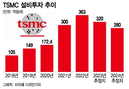 TSMC는 당초 올해 설비투자 규모를 320억~360억달러(41조9200억~47조1600억원)로 제시했으나 6월 올해 설비투자를 하단에 맞춘 320억달러로 낮춰 잡았다. 이는 지난해 설비투자(363억달러)보다 약 12% 줄어든 규모다.