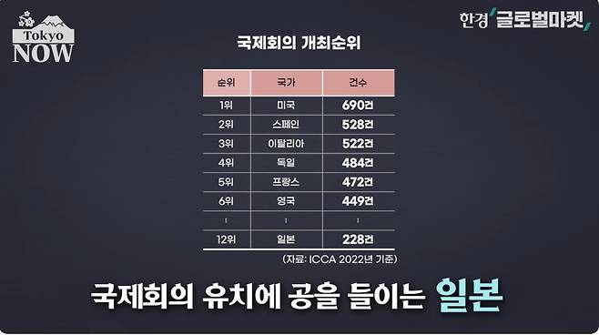 목표를 달성하기 위해 일본이 공을 들이는 분야가 국제회의 유치다. 2022년 일본이 개최한 국제회의는 228건으로 12위에 그쳤다. 일본 정부는 2030년까지 일본을 세계 5대 국제회의 개최국으로 만든다는 목표를 세웠다. 일본 호텔·항공료 '억'소리나게 비싸진 이유④로 이어집니다.
