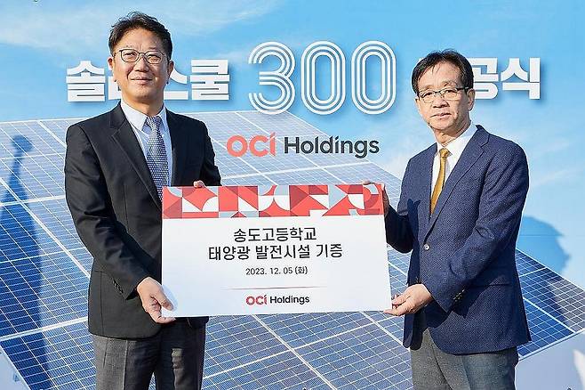 (서울=연합뉴스) 지난 5일 인천 송도고등학교에서 열린 솔라스쿨 준공식에서 성광현 OCI홀딩스 전무(왼쪽)와 이상원 송도고등학교 교장이 기념 촬영을 하고 있다. 2023.12.6 [OCI홀딩스 제공. 재판매 및 DB 금지]