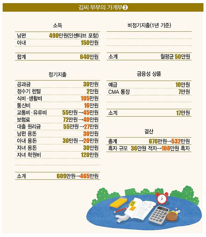 문제는 부부의 가계부가 매월 적자를 기록하고 있다는 것이다. 그럼 이 가계의 재무상태를 한번 더 살펴보자. 김씨 부부는 공과금 30만원, 정수기 렌털 2만원, 식비·생활비 120만원, 통신비 20만원, 교통비·유류비 55만원, 보험료 72만원, 대출 원리금 55만원, 남편 용돈 40만원, 아내 용돈 30만원, 자녀 용돈 30만원, 신용카드 할부금 35만원, 자녀 학원비 120만원 등 매월 609만원을 지출했다.